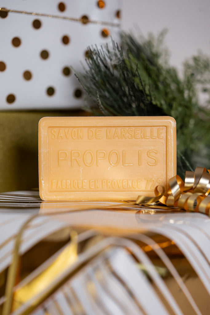 El propóleo es la valiosa resina protectora de las abejas, que garantiza la higiene y la defensa en la colmena. Regale a sus amigos y familiares un toque de fuerza y protección natural en Navidad, una idea de regalo ideal para la estación fría. El Jabón de Miel y Propóleo nutre, calma y suaviza la piel. Enriquecido con propiedades antioxidantes y valiosos nutrientes, el propóleo ayuda a la piel a regenerarse y la deja flexible. Un regalo de la naturaleza que aporta una sensación de bienestar y un poco del poder de las abejas al cuarto de baño todos los días.