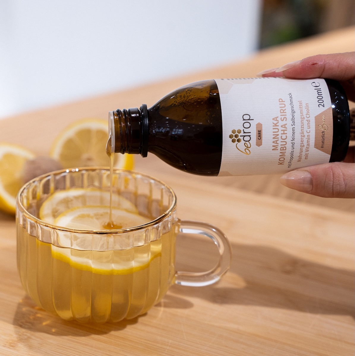 In Kombination mit Manuka Honig und Propolis sorgt fermentierter Kombucha für eine harmonische Rezeptur.